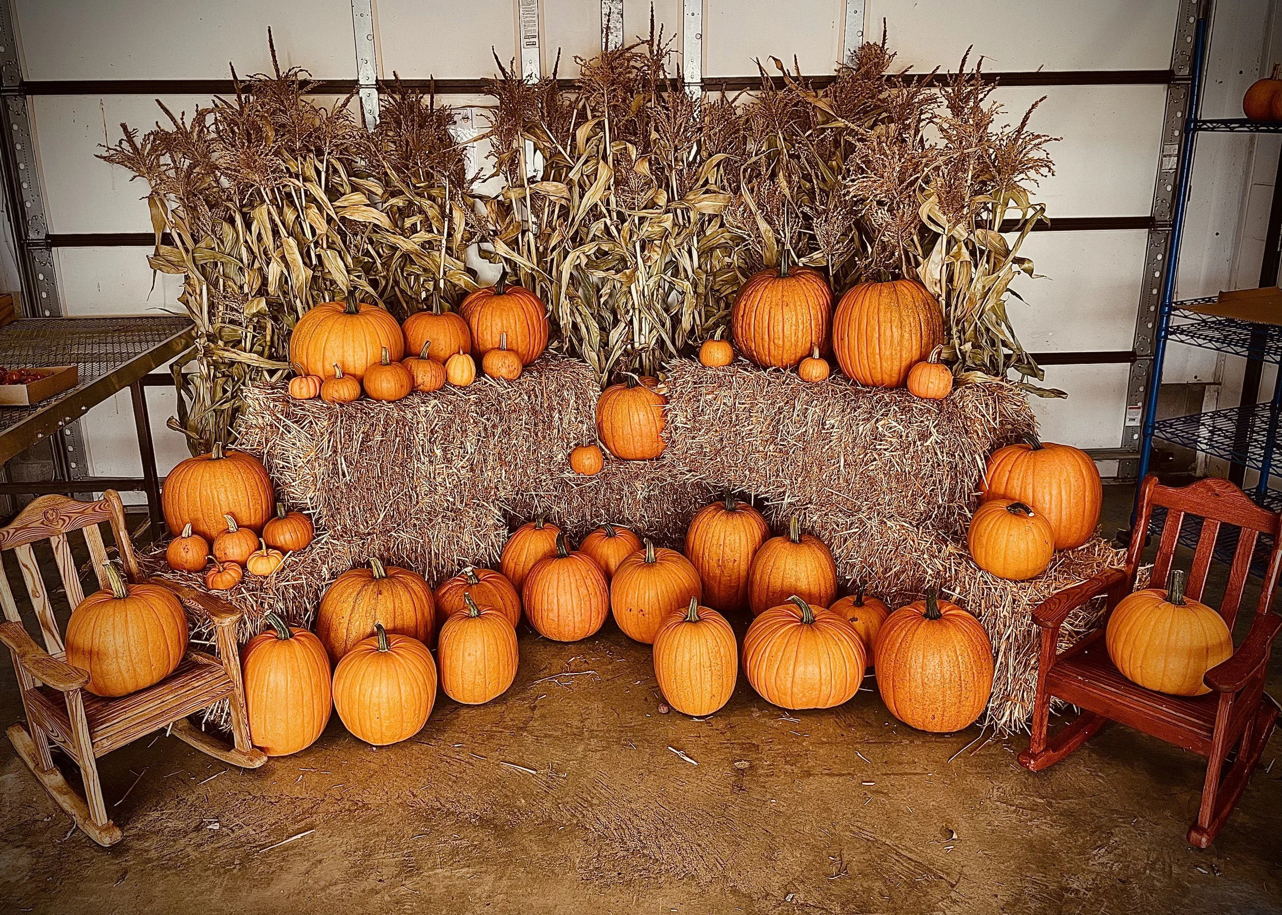 In the Spring we have flowers and vegetable plants. In the Autumn, we have hay, pumpkins, cornstalks, firewood, and vegetables — all available for purchase.